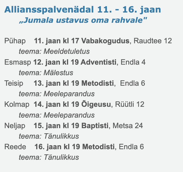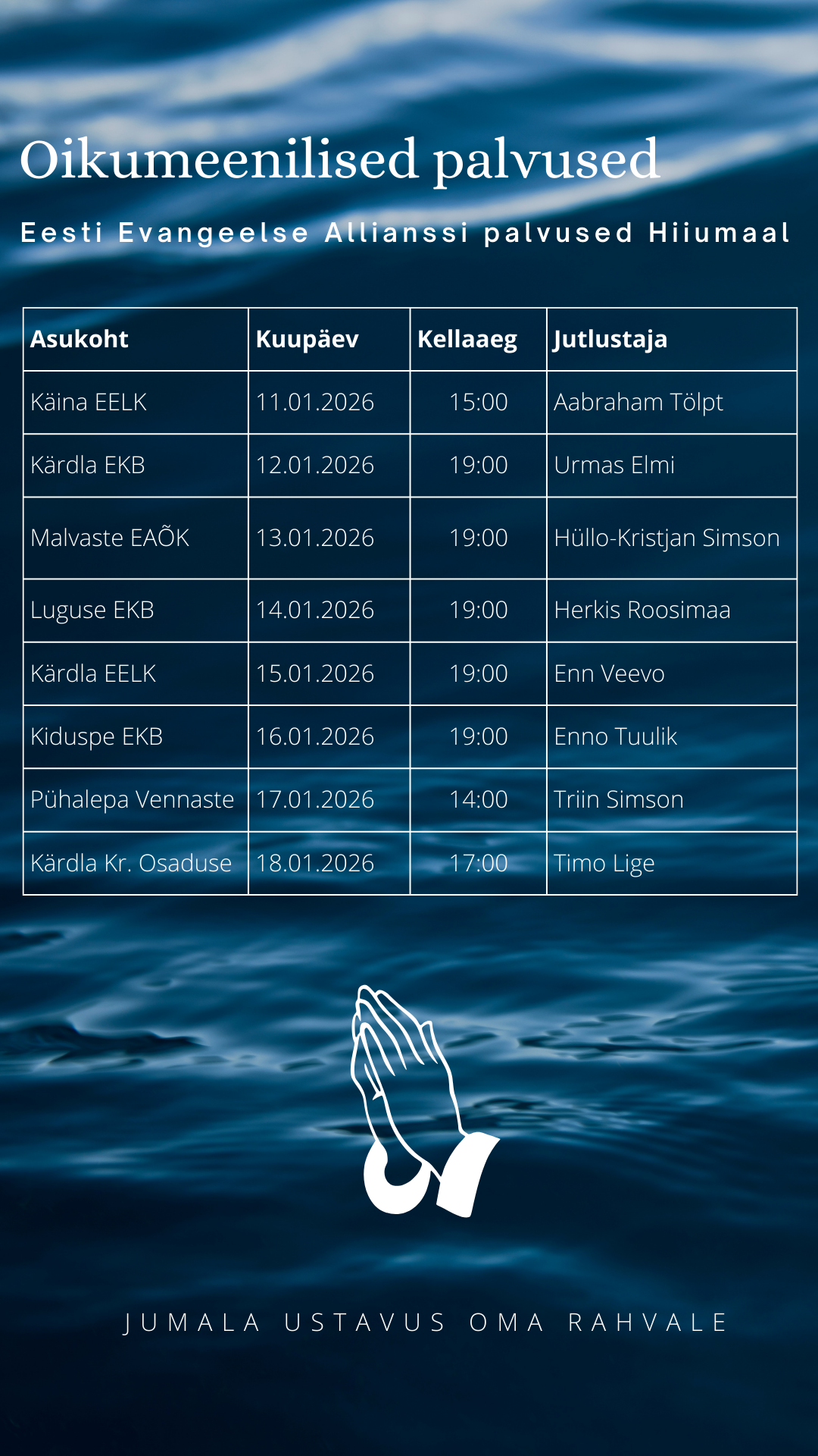 Reede 16.01. – EMK Kuressaare kogudus, Karja tn 1; kell 19:00, jutlustab pastor Leevi Väli